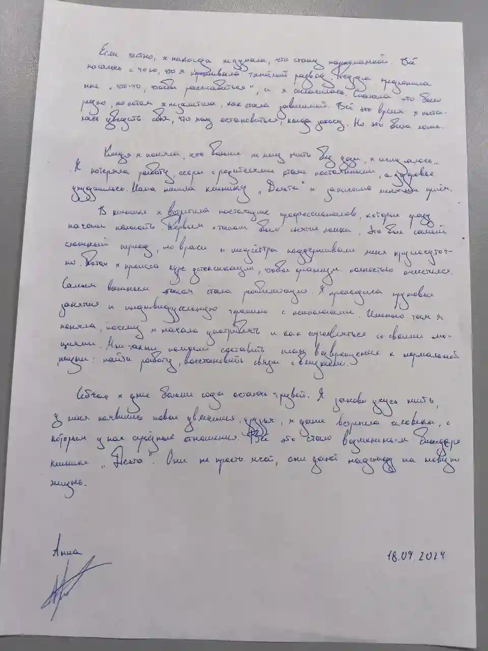 Если честно, я никогда не думала, что стану наркоманкой. Всё началось с того, что я переживала тяжёлый развод. Подруга предложила мне "что-то, чтобы расслабиться", и я согласилась. Сначала это было редко, но потом я не заметила, как стала зависимой. Всё это время я пыталась убедить себя, что могу остановиться, когда захочу. Но это была ложь. Когда я поняла, что больше не могу жить без дозы, я испугалась. Я потеряла работу, ссоры с родителями стали постоянными, а здоровье ухудшилось. Мама нашла клинику "Дельта" и записала меня на приём.